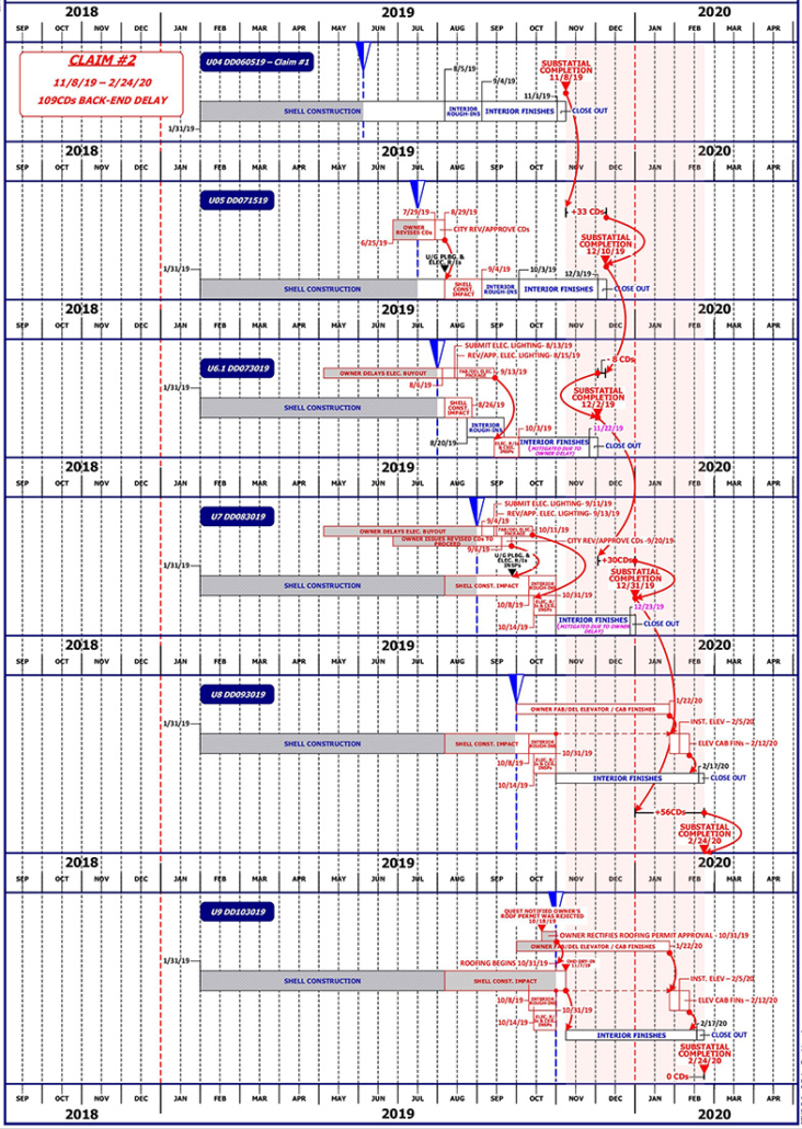 Following each schedule update and in instances where delay is driven by factors outside of contractor’s control we furnish the project management team with schedule reports that convey delay impacts on the project’s completion and support the contractor’s request for time. However, contractors sometimes prefer to refrain from time extensions requests on each occasion a schedule update indicates delay is outside of contractor’s control and opt to reserve these issues for later reconciliation. Alternatively, contractors may request time extensions on the basis of supporting schedule reports but may not receive the requested time from owners. These and other scenarios prompt the need for us to maintain a communicative overall project delay exhibit that captures the impacts of various project delays from one schedule update to the next. This overall delay exhibit alleviates the parties from having to recall what happened when and to ponder the ramifications of select delays on the project’s completion. It furnishes project stakeholders with a clear turn-key visual instrument illustrating delay chronology and is engineered to save the parties time and expense to negotiate settlements.