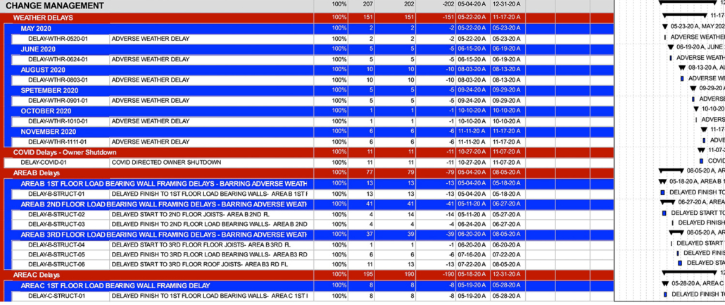 That’s why our standard schedule management process comprises a robust change management WBS section that chronicles a host of delays routinely spanning permitting, scope changes, design issues, subcontractor production delays and weather, among others. In each schedule update, we work diligently with the project management team to integrate project delays both as sequenced fragnets to their corresponding tasks and with written notations to tasks and milestones that over time build a narrative of controlling delays in the digital schedule file. We regularly ask the project management team to cite dates and sources of incorporated delays with references to RFIs, OAC meetings, collateral documentation and other controlling digital correspondence, mindful to ensure the delay narrative’s integrity in the likely event of third-parties’ future review of schedule files.